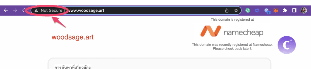 หลังจากที่เราซื้อ Domain Name มา ตอนแรกมัน จะขึ้น ว่าเป็น Not Secure หรือ “ไม่ปลอดภัย” แบบในรูป เพราะเว็บนี้ ยังไม่ได้ติดตั้ง HTTPS และ ยังเป็น HTTP อยู่ ซึ่งในตัวอย่างคือ http://www.woodsage.art/