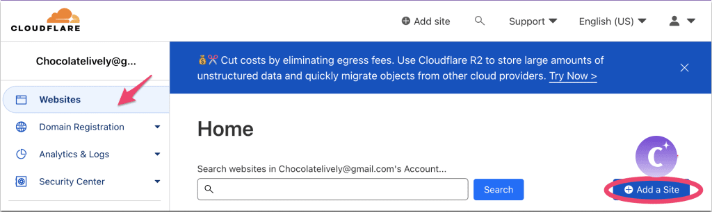 หลังจากสมัครแล้ว ที่หน้า Home ให้เลือกเมนู Websites ตามที่เห็นในรูป โดยกดปุ่ม Add a Site