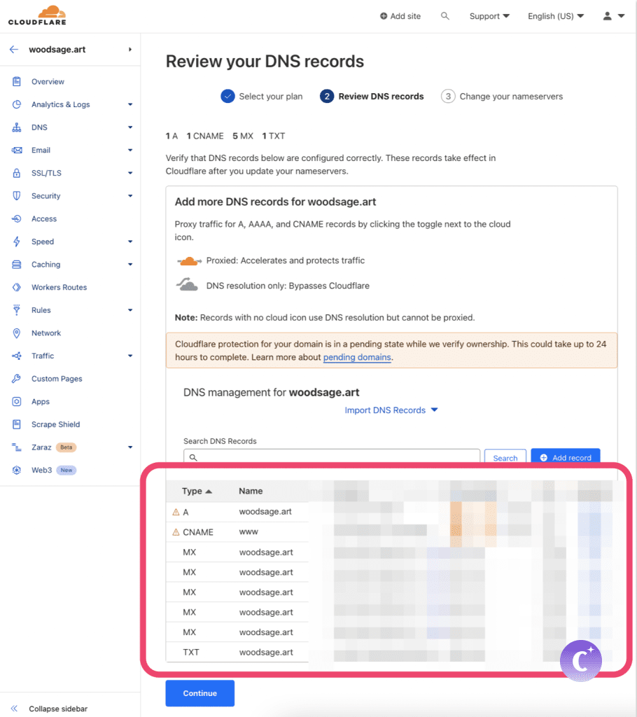 หลังจากนั้น เว็บ Cloudflare ก็จะแสดงให้เห็นว่า เขาจะ สร้าง อะไรบ้าง เช่น A, CNAME เป็นต้น ตามรูปค่ะ