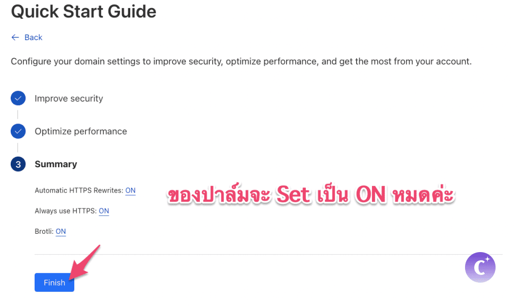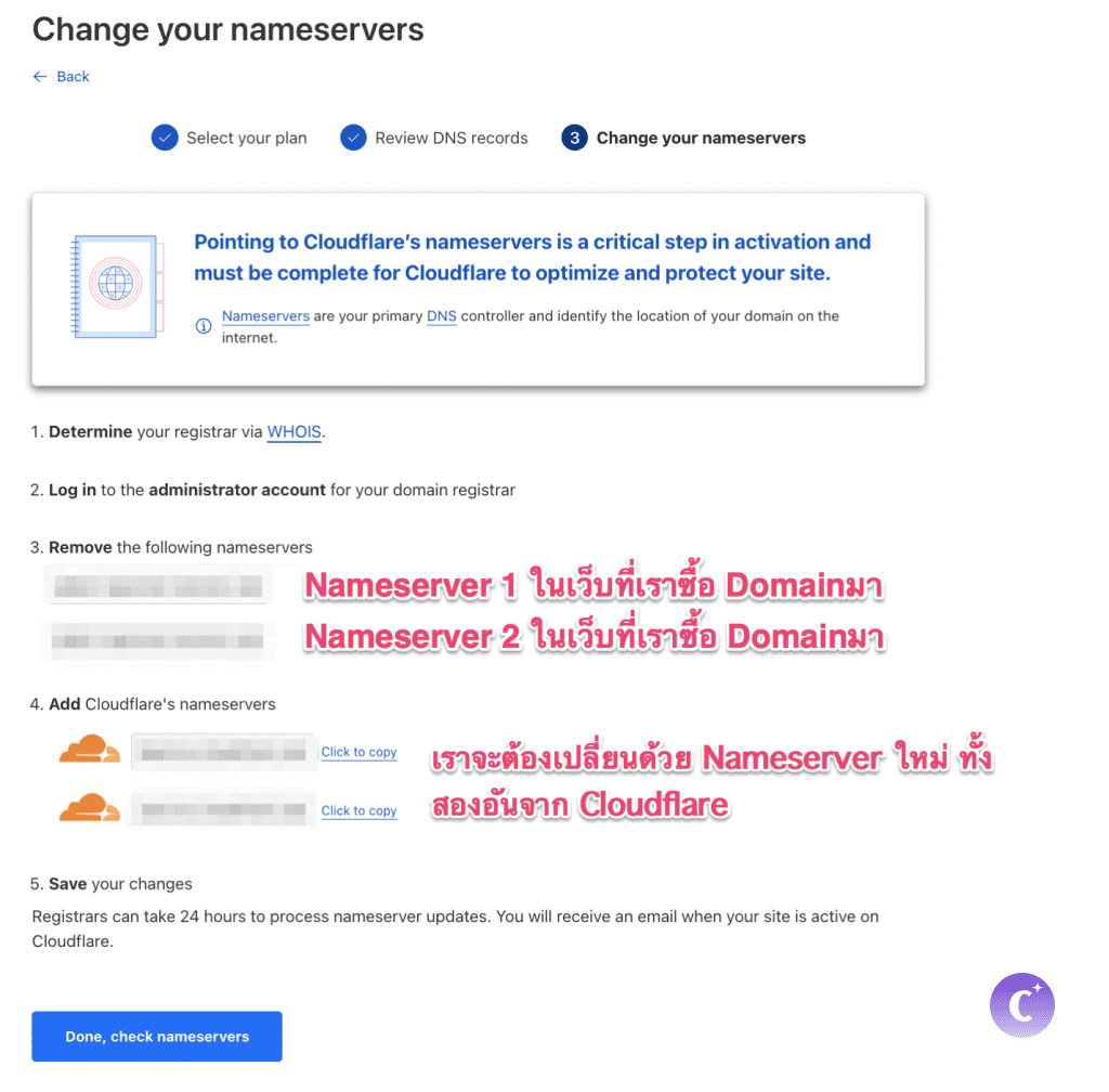 หลังจากเสร็จ ก็กลับไปที่ Cloudflare แล้ว กด ปุ่ม Done, check nameservers