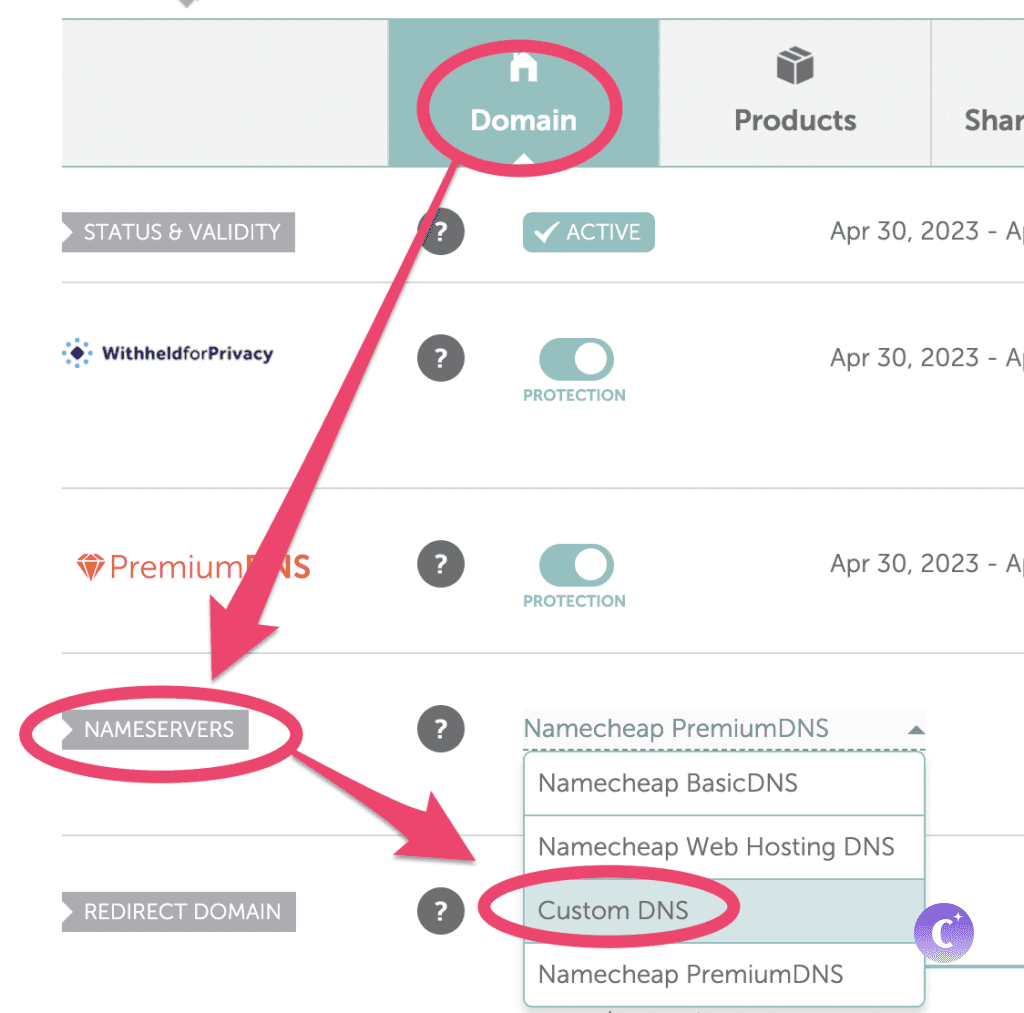 หลังจากนั้นใน แท็บ Domain ให้ไปที่ Nameservers เพื่อ แก้ โดย เลือก “Custom DNS”