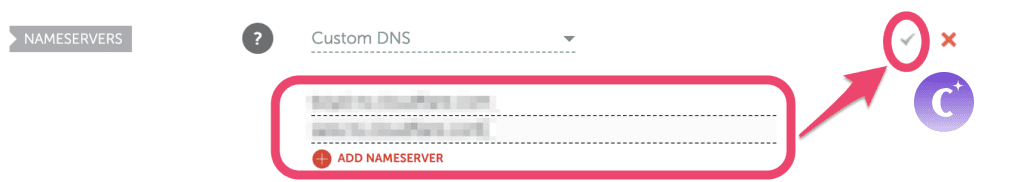 หลังจากนั้นก็เอา Nameservers ทั้ง2 อัน ที่เราก๊อปมาจากCloudflare ไปเปลี่ยนตามรูป แล้ว กดยืนยันโดย กดที่ปุ่มเครื่องหมายถูก ตามรูปค่ะ