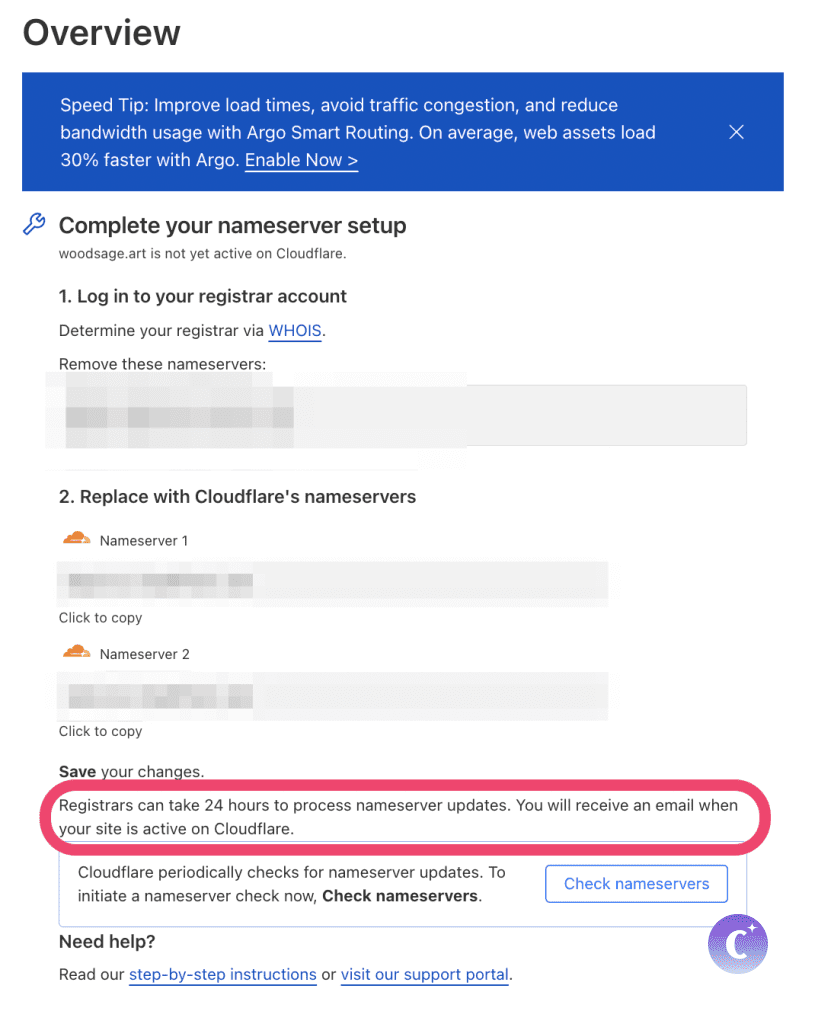 Cloudflare จะบอกว่า หลังจากนี้ จะใช้เวลา ประมาณ 24ชม. แล้ว ตัว Nameservers ใหม่ถึงจะลงทะเบียนสำเร็จ ตามในรูปนะคะ